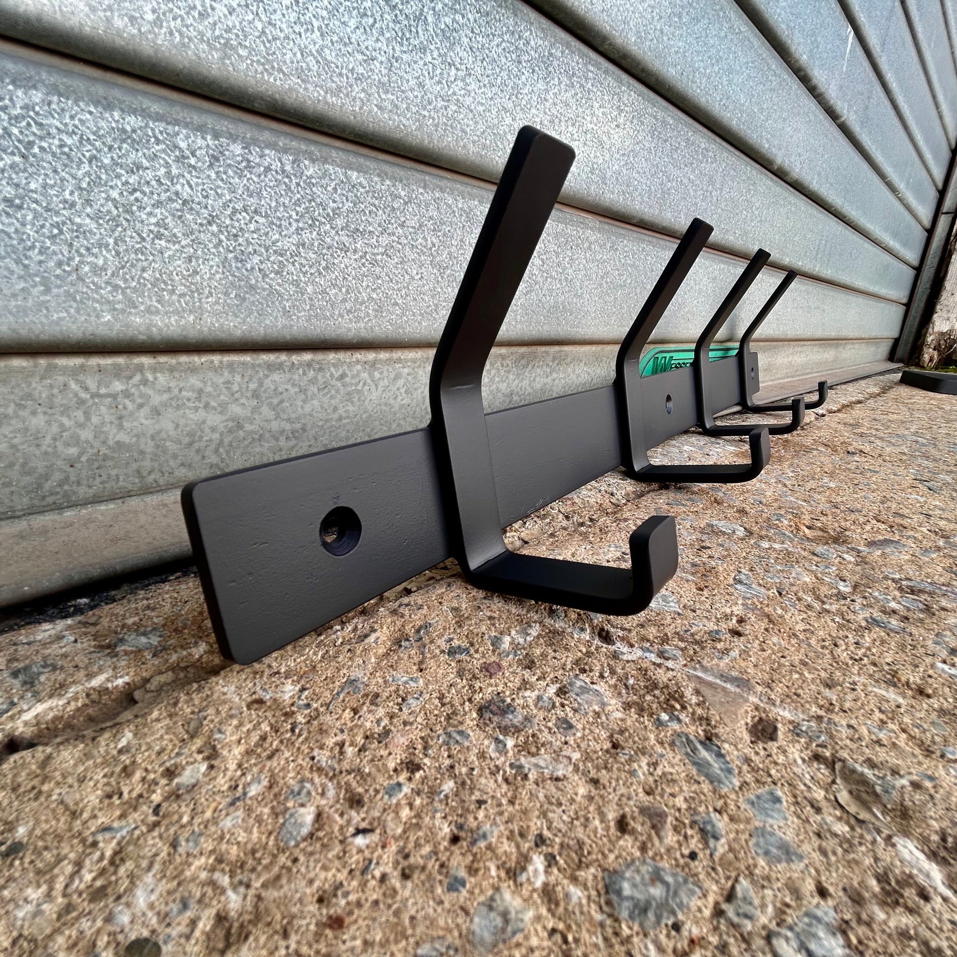 Steel wall mounted coat rack providing a modern industrial feel to your entryway or cloakroom. The double metal wall hooks are a perfect storage rail for all types of accessories and clothing, including bags, coats, jackets, towels and bathroom robes.